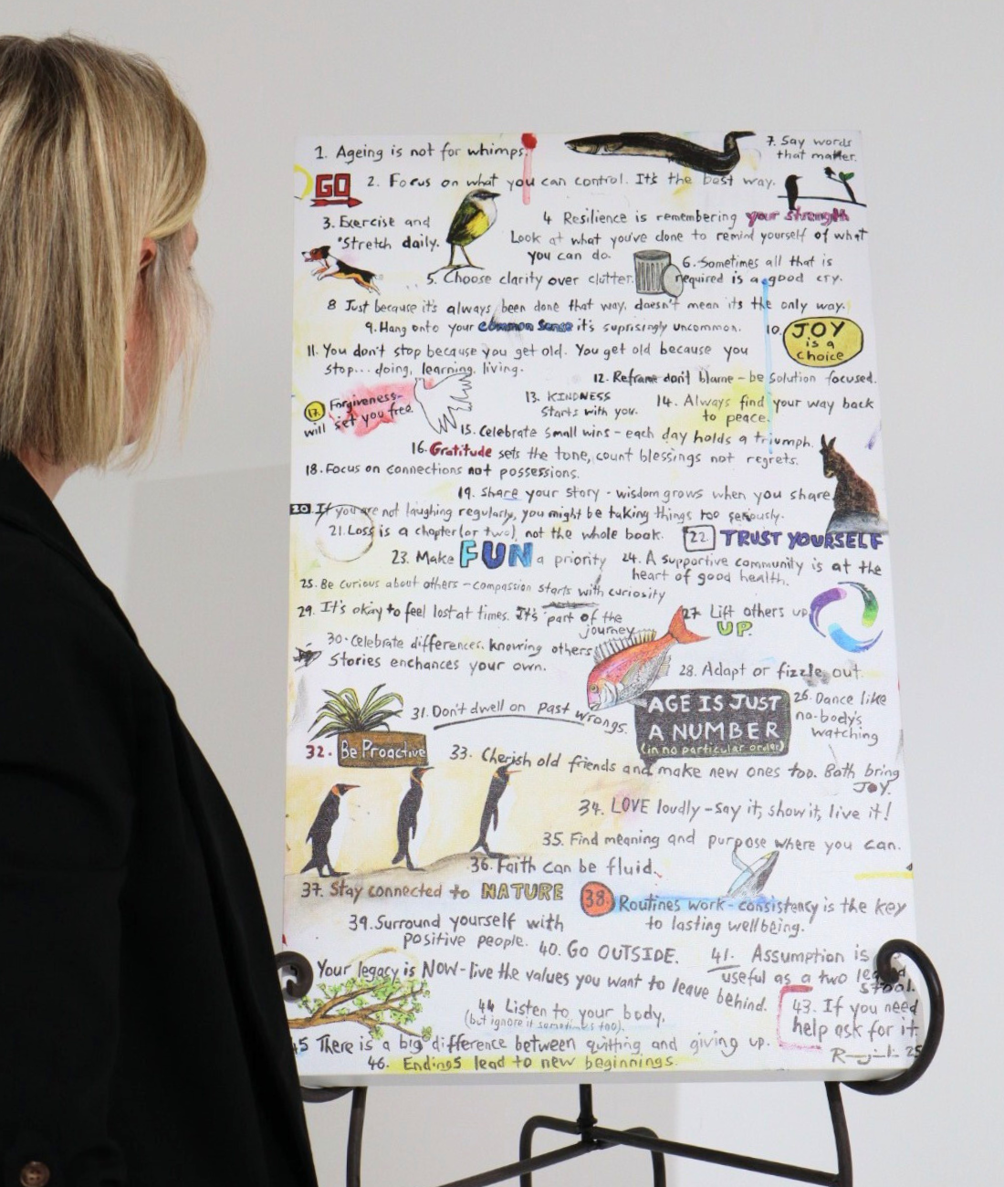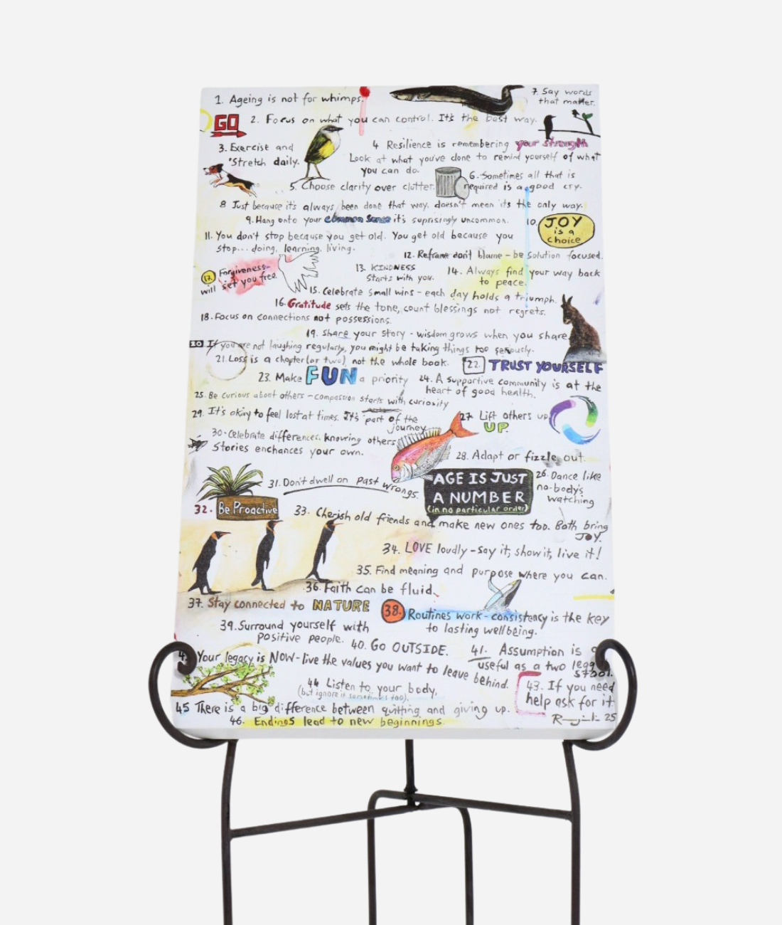 Age Is Just A Number inspires and empowers people to embrace aging with purpose, vitality, and joy. Through 46 uplifting insights, this artwork encourages individuals to take a proactive approach to well-being, fostering a mindset that values growth, wisdom, and positivity at every stage of life.